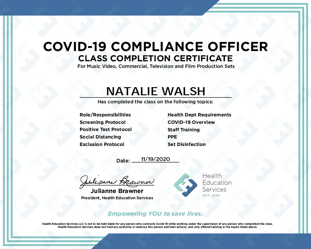 I am now a certified Covid 19 compliance officer for Music Video, Commercial, Television and Film Production.